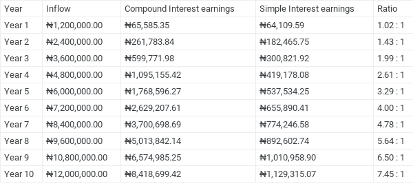 An interesting thing to note is that by 2033 (after 13 years of investment), the total inflow (principal) would be ₦15,600,000 and if the interest rate remains 10%, the total earnings should be ₦31,549,547.10. This means that the interest is now equal to the principal at ₦15,949,547.10.